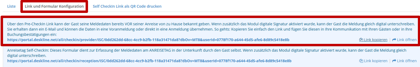 Der Pre Check-In ist ein Link den ihr im Punkt „Gästemeldung“ – „Pre-CheckIn“ – „Link und Formular Konfiguration findet.