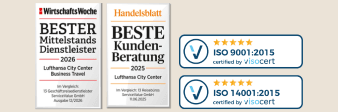 Alle Angebote und Preise im Lufthansa City Center Newsletter sind tagesaktuell. Bitte beachten Sie, dass sich Verfügbarkeits- und Preisänderungen ergeben können. Gerne stehen wir bei Fragen persönlich zur Verfügung.